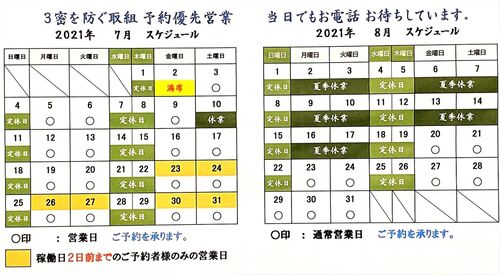 本日で、令和3年前期は終了。あっという間の6か月。今年後半は、まさに変動・激動の6か月となります。なにがあろうが「はこきび」よろしくお願いいたします。7月・8月の最新営業スケジュールを示します。〇印の日のご予約をお待ちしています。